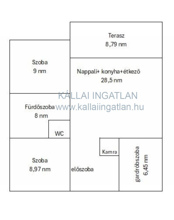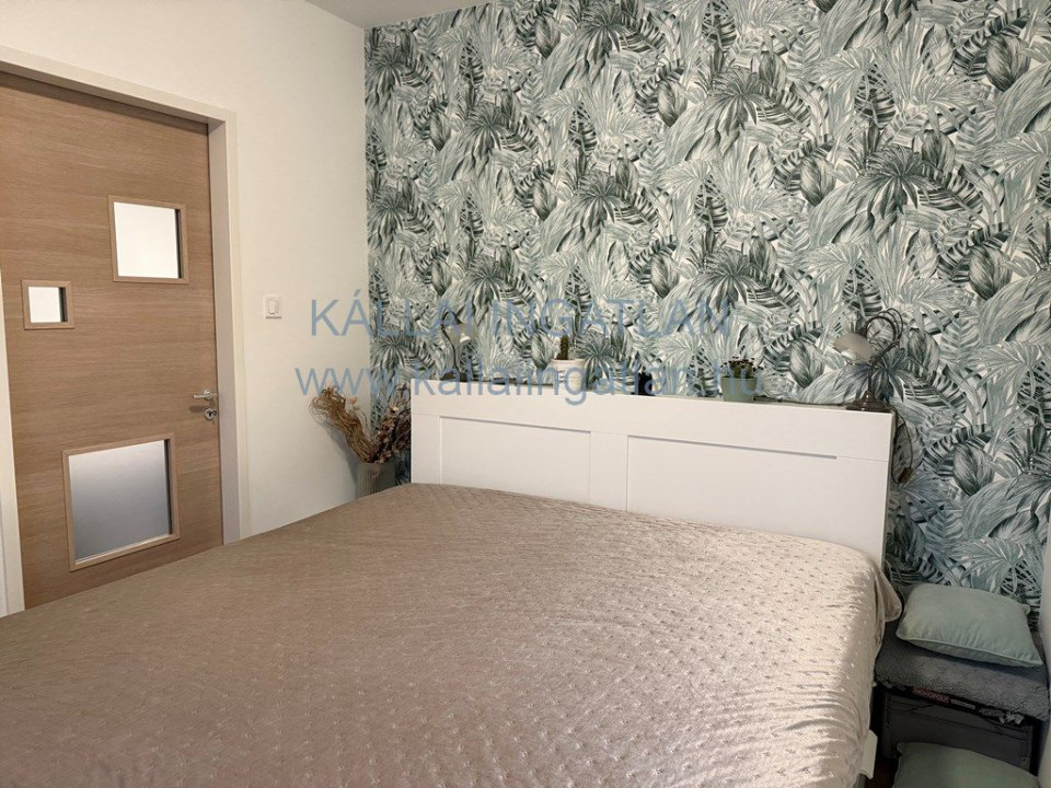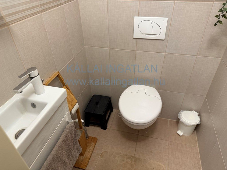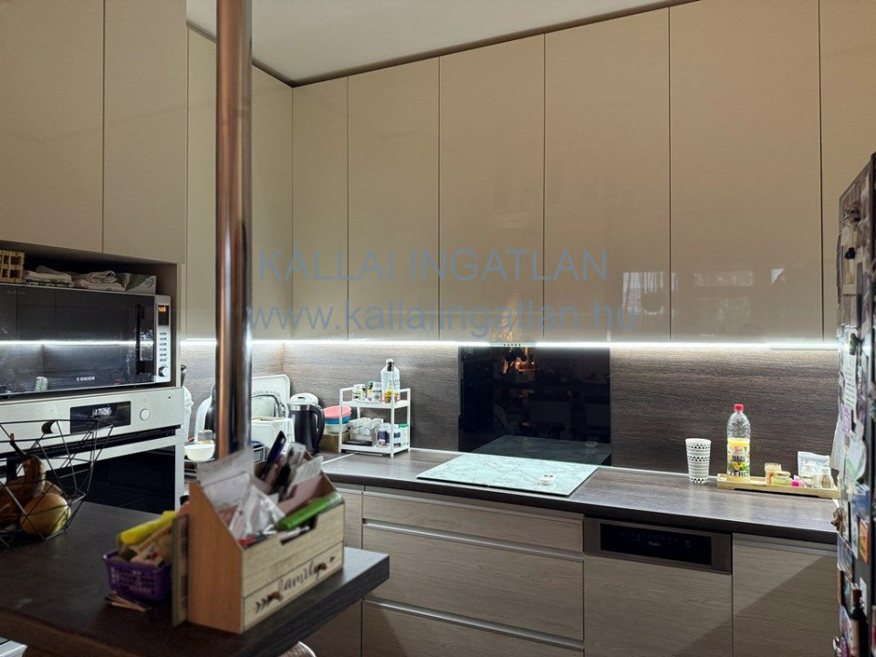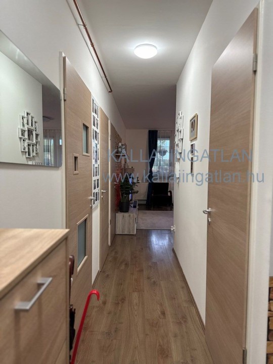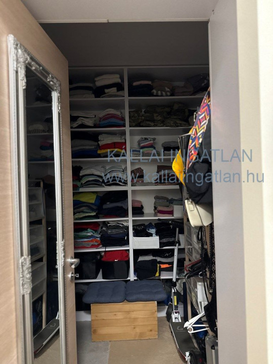Az ingatlan elosztása: amerikai konyha-étkező-kamra-nappali + 2 szoba, gardróbszoba, tágas fürdőszoba, melyben kád és zuhanyzó található. A WC külön helyiségben van. Nappaliból 10 nm-s terasz nyílik.