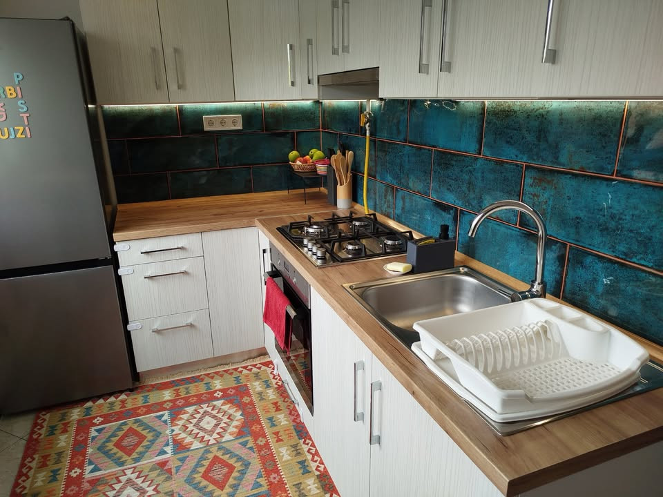 - új, asztalos által készített egyedi konyhabútor, beépített főzőhellyel, led megvilágítással;