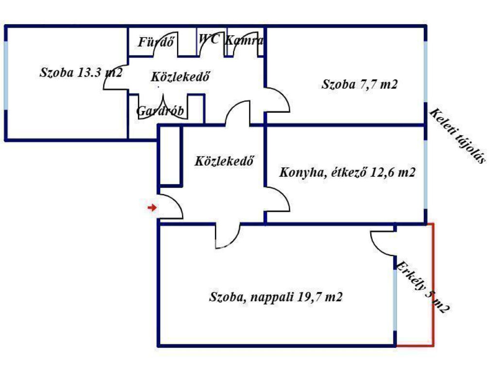 Nagyon jó, praktikus elrendezésű 3 külön nyíló hálószoba, - az egyik erkély kapcsolattal - tágas konyha-étkező, kamra, kádas fürdőszoba, külön WC-vel,
