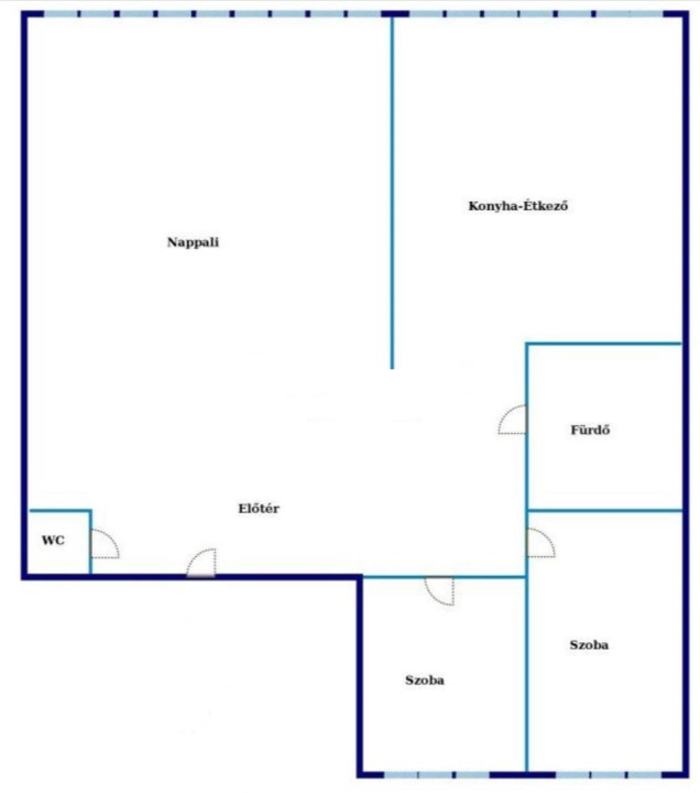 Elosztása: nappali, konyha, 2 külön nyíló hálószoba, fürdőszoba, külön wc.