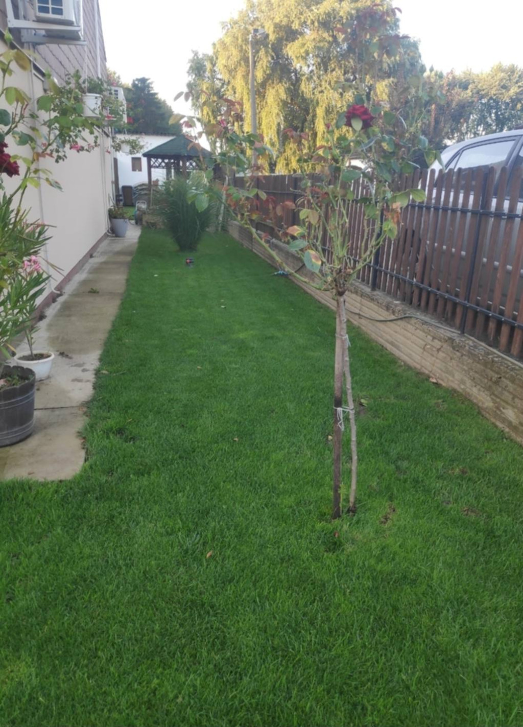 Szélső ingatlan, saját, lekerített oldal- és hátsó kerttel rendelkezik.