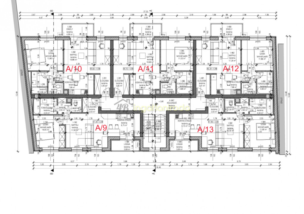 Nyíregyháza belvárosában eladásra kínálok egy 2026. május végén 100 % készültségben  átadásra kerülő, új építésű,  2 szintes,  10 lakásos zárt udvarostársasházban kialakításra kerülő lakásokat.Mindkét szinten 5-5 lakás kerül megépítésre, a földszinten egy 48 m2 alapterületű, utcafronti bejárattal rendelkező üzlethelyiség, valamint  7 belső udvari garázst és több udvari beállót. Az ingatlanok vételára: 950.000,-Ft/m2.Az első emeleten:101. számú lakás 48,29 m2 hasznos alapterületű, 3,17 m2 loggiával, keleti fekvéssel 47,3 Mft201. számú lakás 50,14 m2 hasznos alapterületű, 3,6 m2 erkéllyel, nyugati fekvéssel 47,7 MFt301. számú lakás 48,56 m2 hasznos alapterületű, 3,6 m2 erkéllyel, nyugati fekvéssel 46,5 Mft401. számú lakás 46,39 m2 hasznos alapterületű, 3,6 m2 erkéllyel, nyugati fekvéssel 44.1 MFt501. számú lakás 45,62 m2 hasznos alapterületű, 3,24 m2 loggiával, keleti fekvéssel 44,9MFtA második emeleten:101 számú lakás 45,61 m2 hasznos alapterületű, 3,24 m2 loggiával, keleti  fekvéssel 44,9 MFt201 számú lakás 49,66 m2 hasznos alapterületű, 3,66 m2 erkéllyel, nyugati fekvéssel 47,2 MFt301. számú lakás 48,16 m2 hasznos alapterületű, 3,6 m2 erkéllyel, nyugati fekvéssel 45,8 MFt401. számú lakás 46,39 m2 haszn os alapterületű, 3,6 m2 erkéllyel, nyugati fekvéssel 44,1 MFt501. számú lakás 45,63 m2 hasznos alapterületű, 3,24 m2 loggiával, keleti fekvéssel 44,9 MFtMűszaki paraméterek: Porotherm 30-as tégla, 15 cm szigeteléssel, gáz-, padló fűtéssel, , 3 rétegű műanyag nyílászárókkal, Klímával felszerelve. A lakásokhoz udvari beálló valamint garázsok  vásárolhatók:  2,5 Mft+ÁFA. garázsok ára: 10 MFt.A leendő tulajdonosok saját igényeinek kiválaszthatják a burkolatokat, szanitereket, belső nyílászárókat. Az ingatlanokra CSOK HITEL igényelhető. Irodai azonosító: 9939