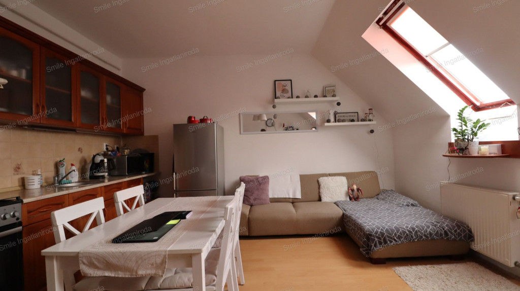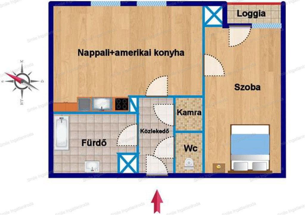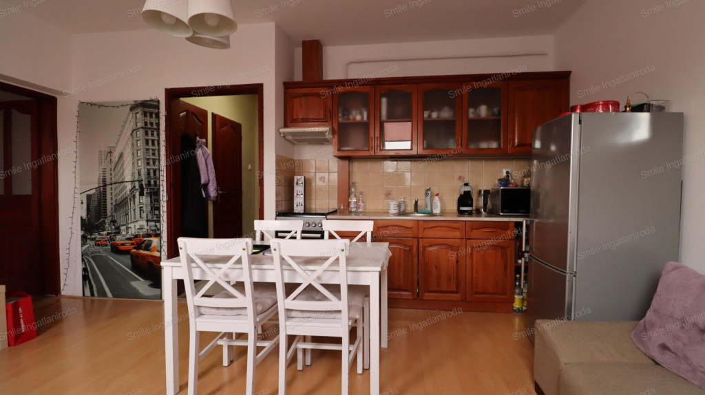- Amerikai-konyhás nappali + hálószoba, kamra, közlekedő, fürdőszoba, WC