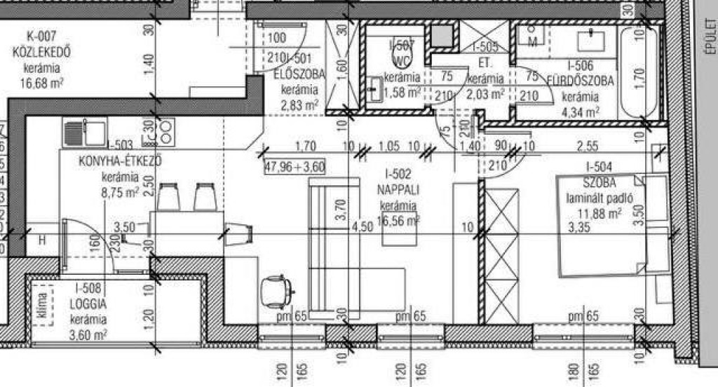 lakás : 47,96m2, loggia: 3,6 m2