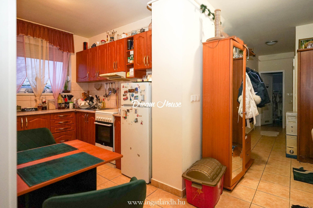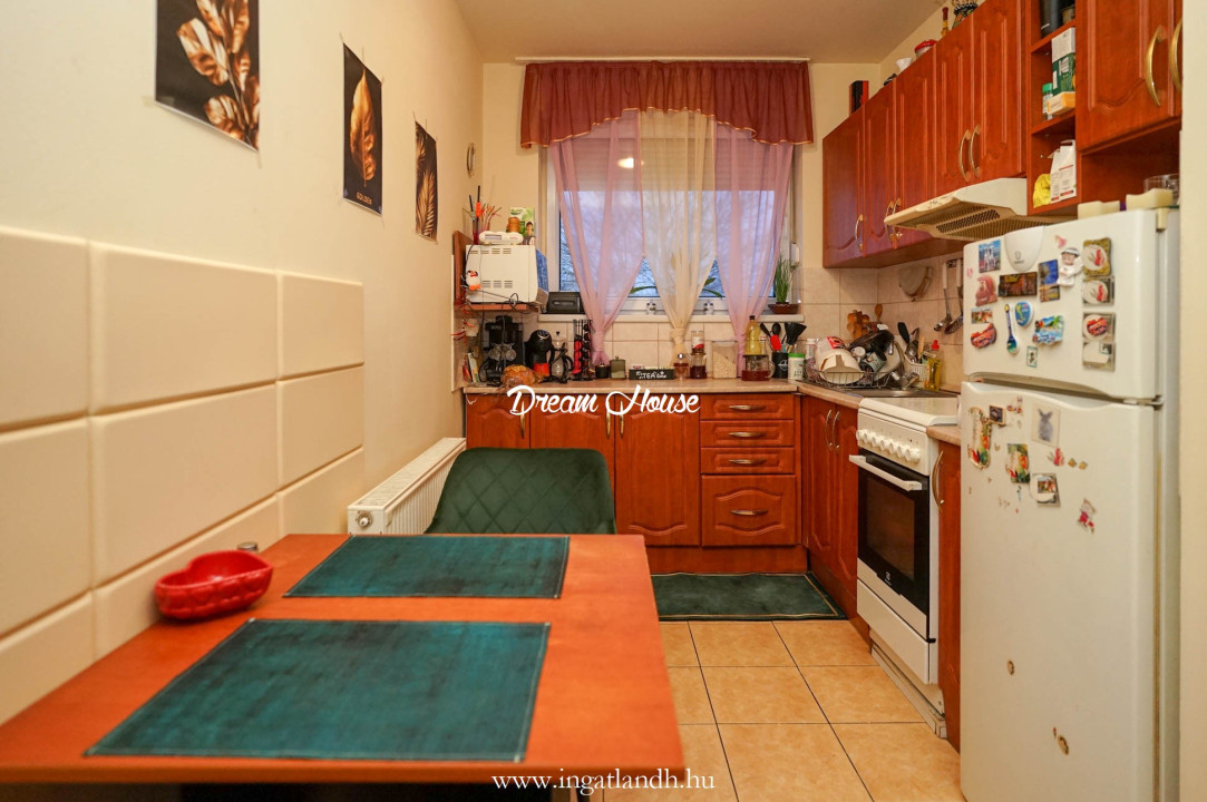 A beépített konyha páraelszívóval felszerelt, nagyméretű nyílászárójának köszönhetően pedig egész nap világos, napfényes.