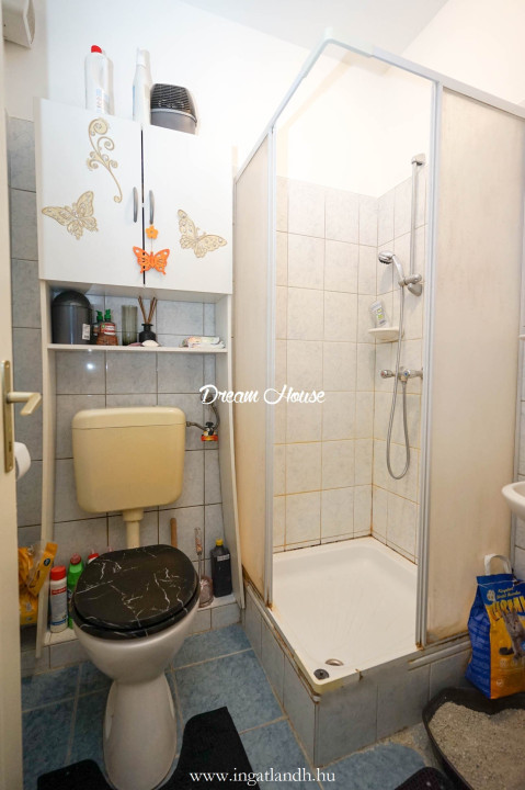 Az átgondolt kialakítás részeként a fürdőszoba mellett egy külön zuhanyzós WC kézmosóval is helyet kapott, ami tovább növeli a komfortérzetet.