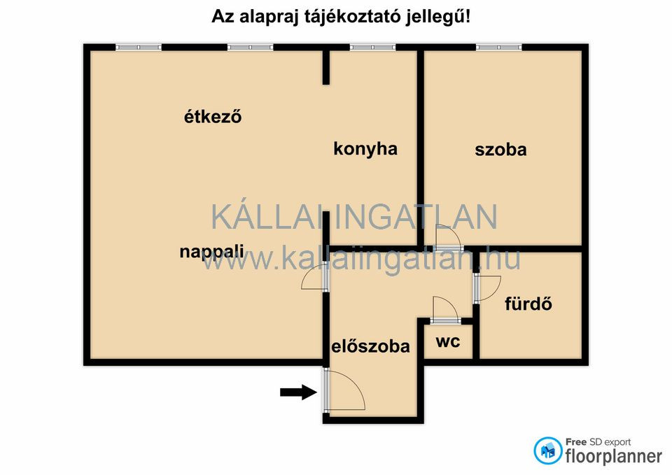 Az ingatlan elosztása: előszoba, amerikai konyhás, nappali + 1 szoba, fürdőszoba, külön WC.
