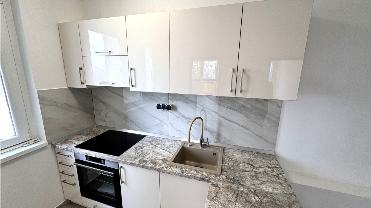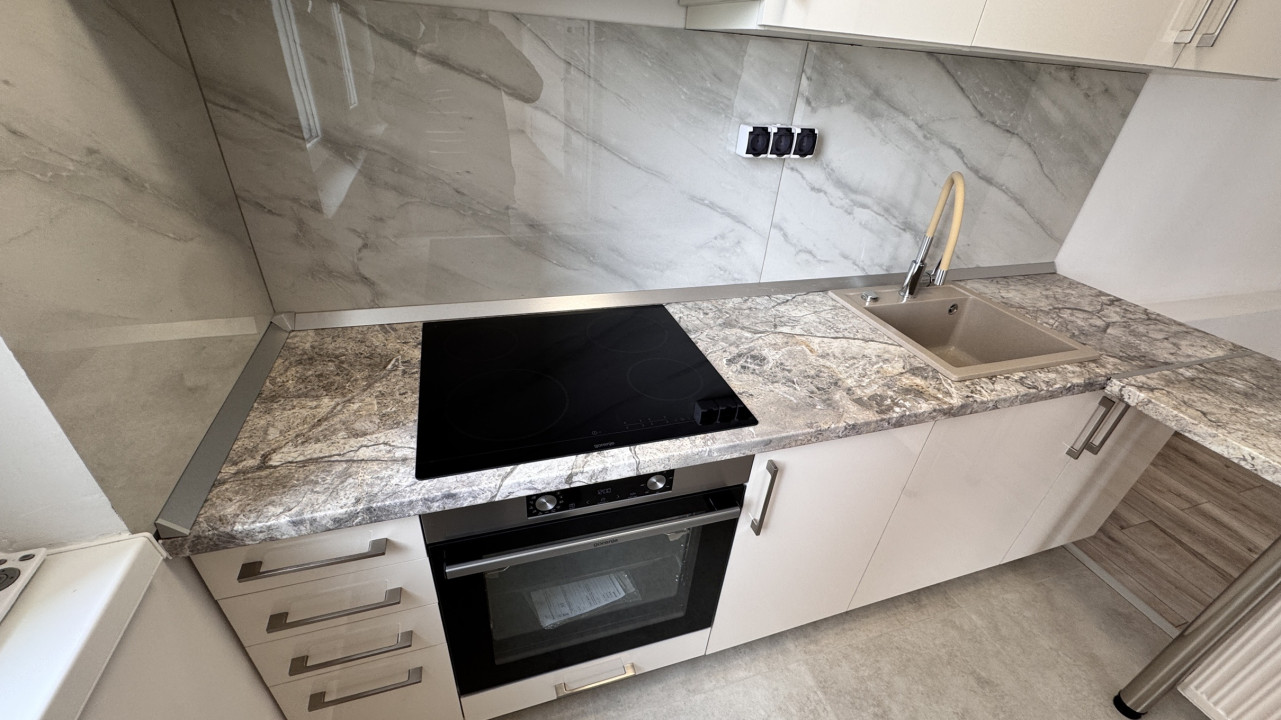 Új egyedi konyhabútor fehér prémium gépekkel ( elektromos főzőlap, beépített sütő, gránit mosogató).