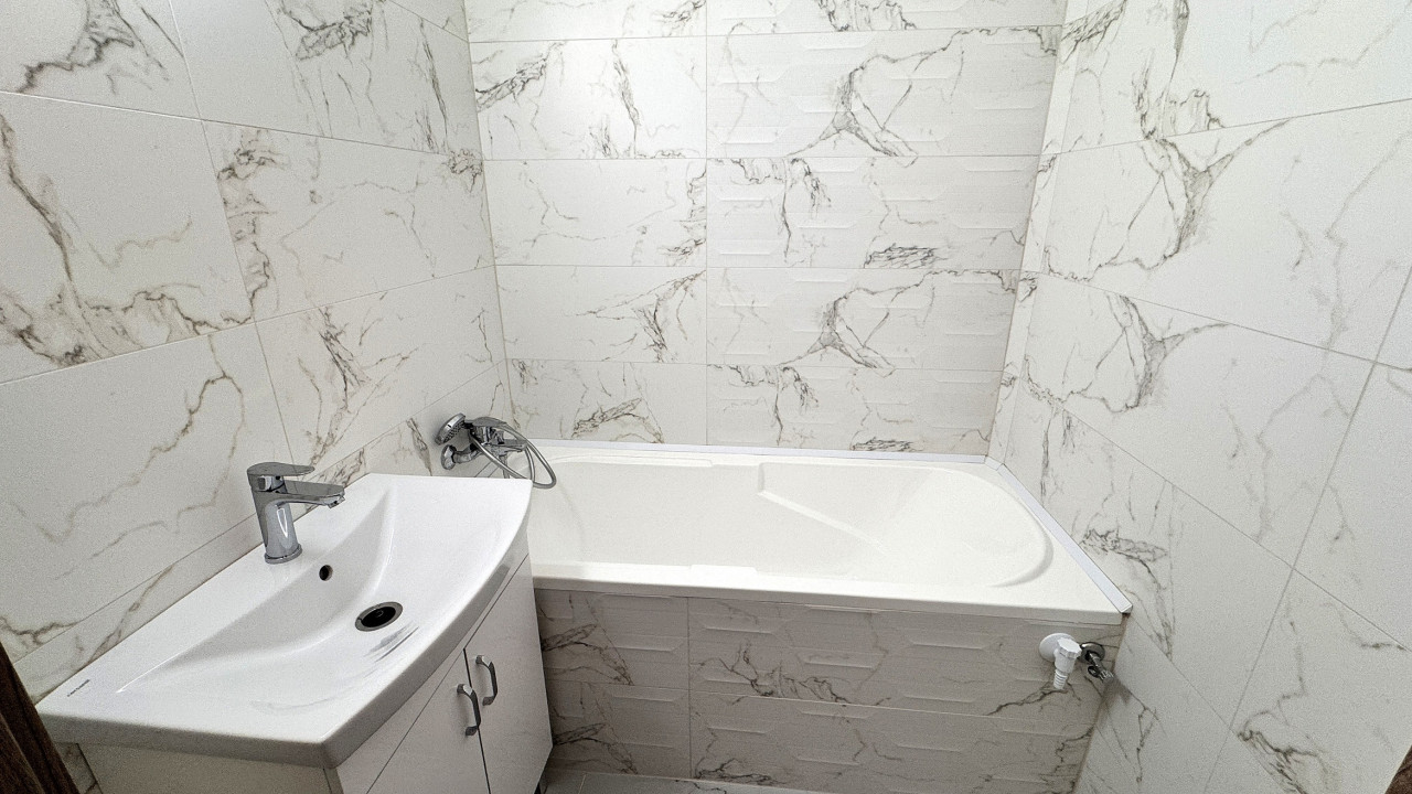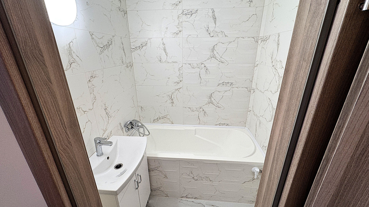 Új kádas fürdőszoba prémium kerámialap burkolattal.