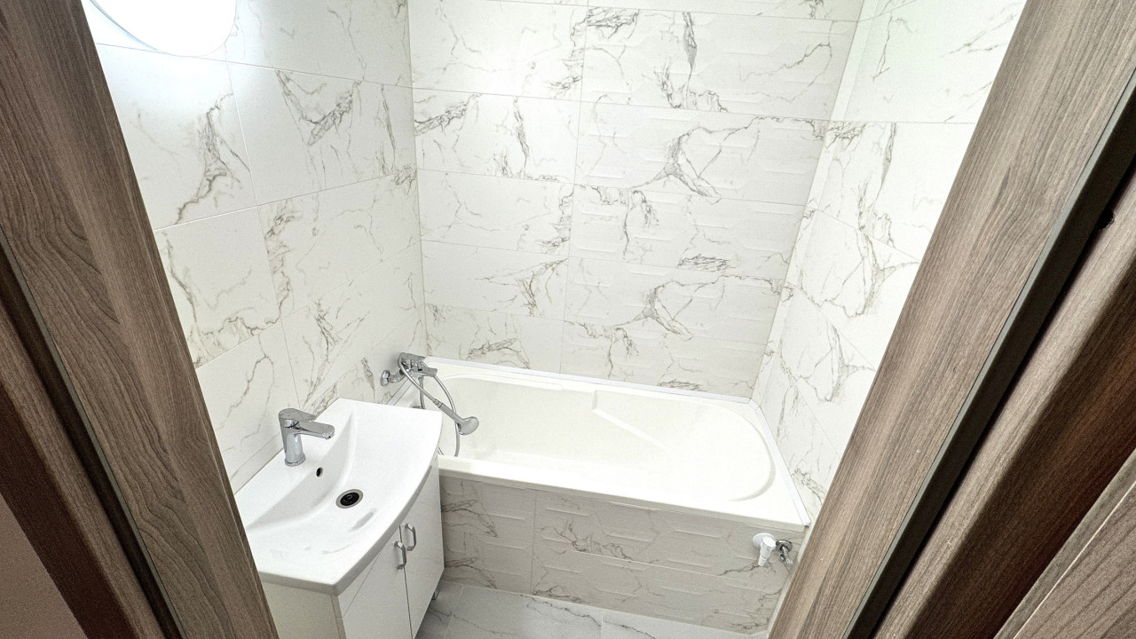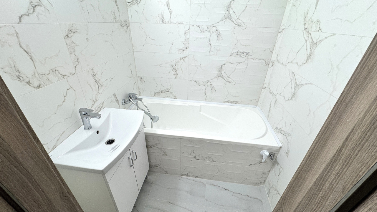 Új kádas fürdőszoba prémium kerámialap burkolattal.