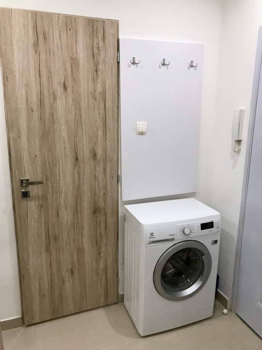 A fotókon látható berendezési tárgyak, bútorok, méretre csináltatott függönyök, új mosógép, tűzhely.