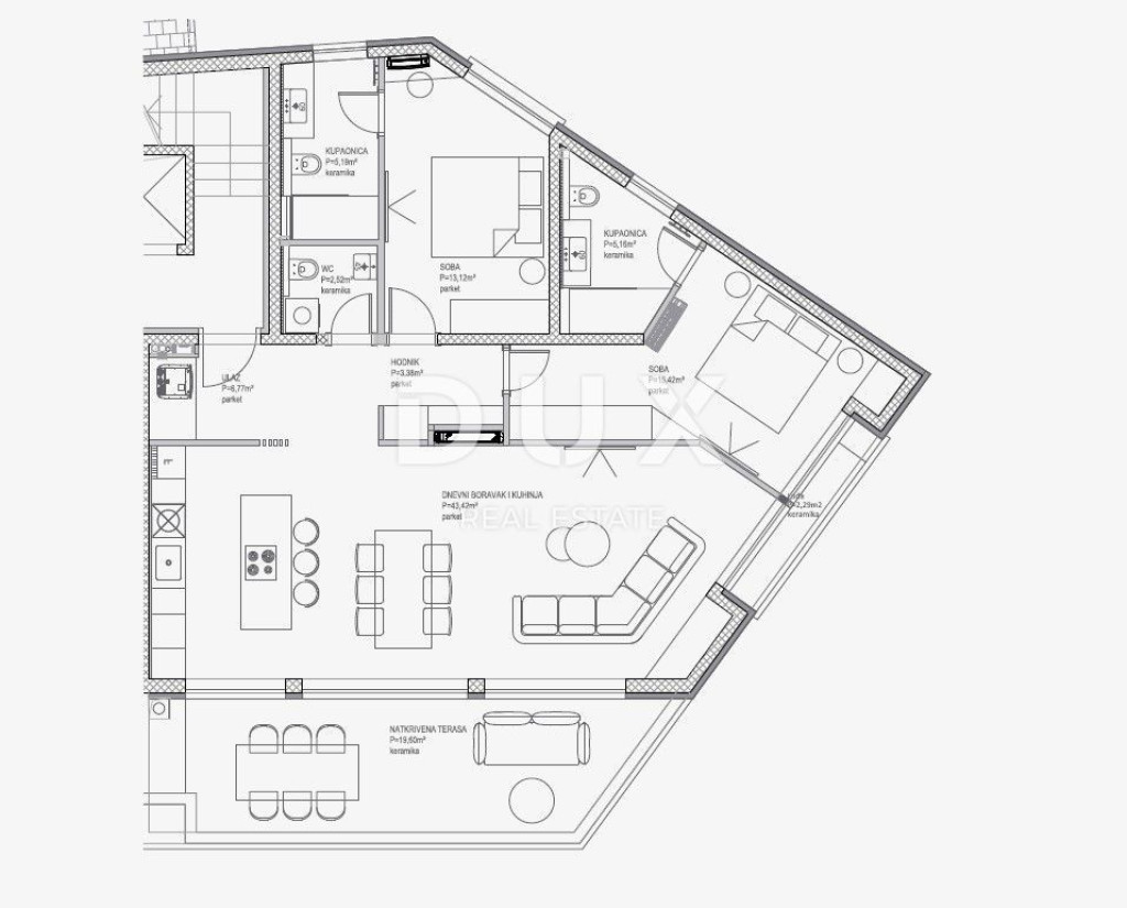 Exkluzív lehetőség a Dux ingatlanban: Eladó 3. számú lakás, 105,93 m2-es alapterülettel, amelyből a terasz 9,80 m2, gyönyörű kilátással a tengerre.