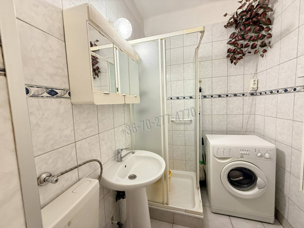 A fürdőszobában a strang és a vízvezetékek cseréje megtörtént, illetve zuhanykabin lett beépítve, a wc csésze is itt található.