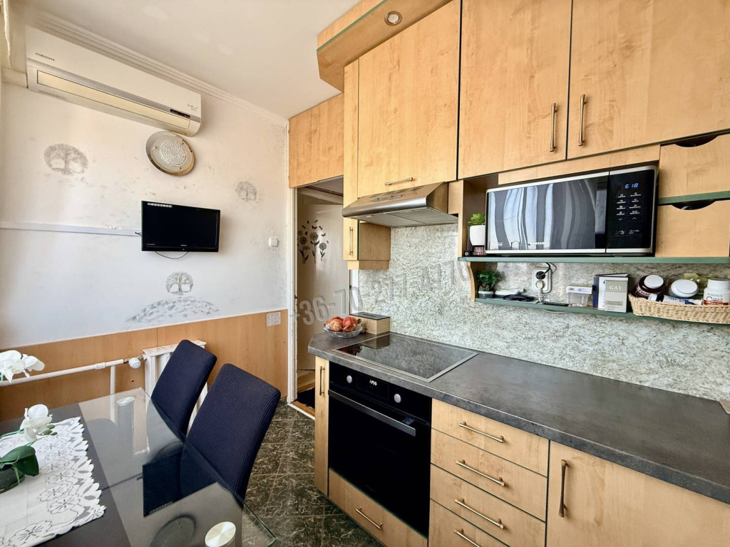 A lakás klimatizált - a nappaliban hűtő, a konyhában hűtő-fűtő klíma található.