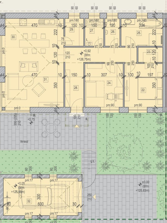 A 86 nm-es lakáshoz tartozik: garázs (18 nm) terasz (23,4 nm), zöldterület 298 nm).