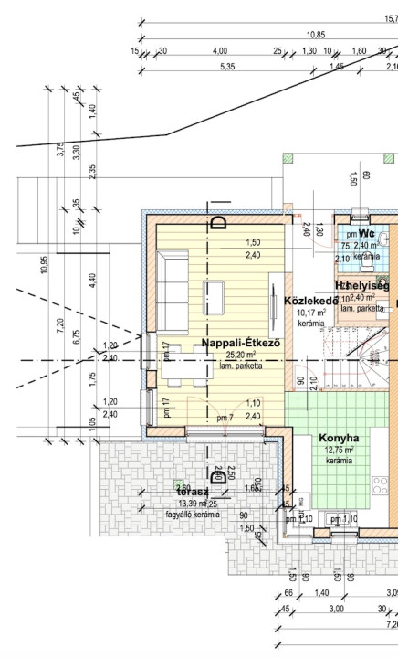 A földszinten található: konyha-nappali-étkező, háztartási helység, WC, terasz.
