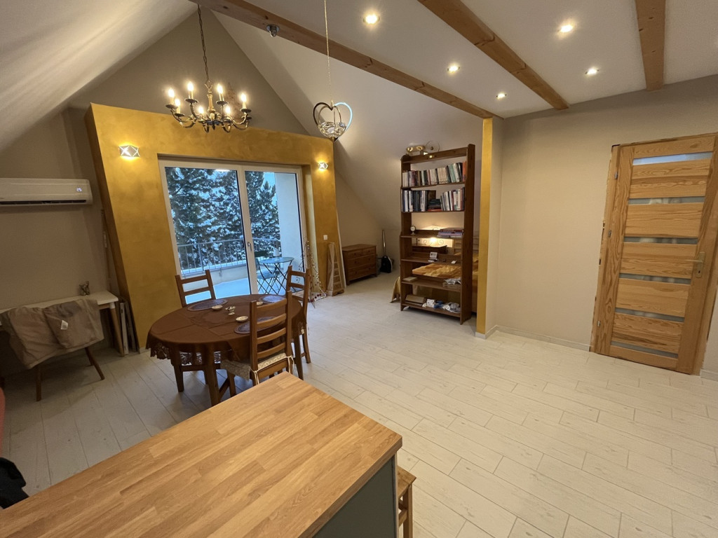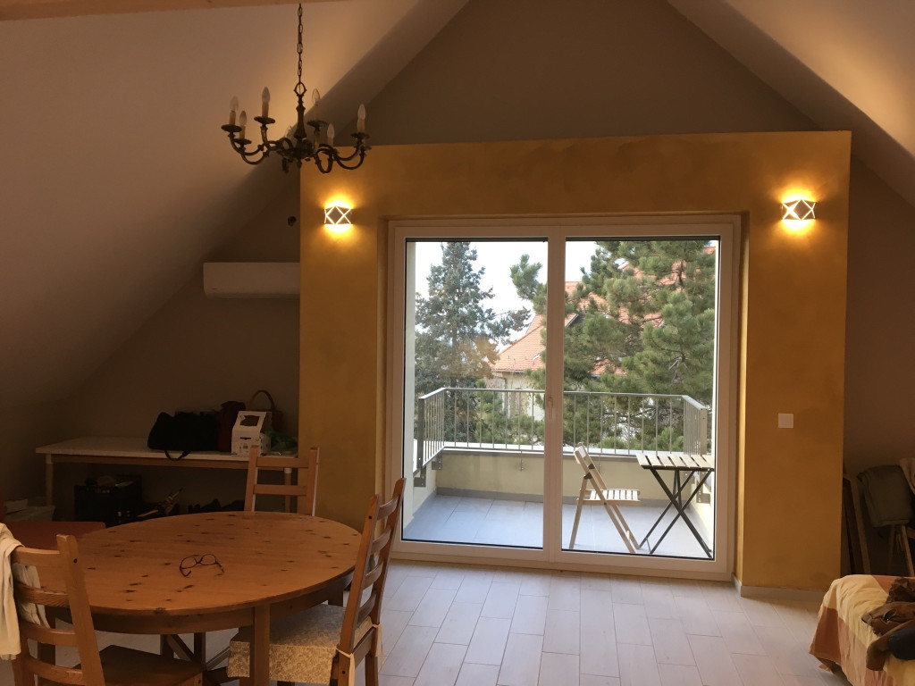 Belmagasság 5 m feletti. Ez a tér a nappaliban is rendelkezésre áll. A konyha és fürdőszoba feletti térben lett kialakítva a galérián, a kb.13 m2 alapterületű második háló helyiség.