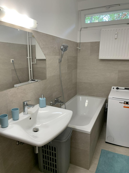 A fürdőszoba olasz minőségi burkolatokkal burkolt, a wc pedig egy új víztakarékos Geberit fali wc , Grohe szaniterekkel és víz csapokkal. Új mosógép beszerelve .