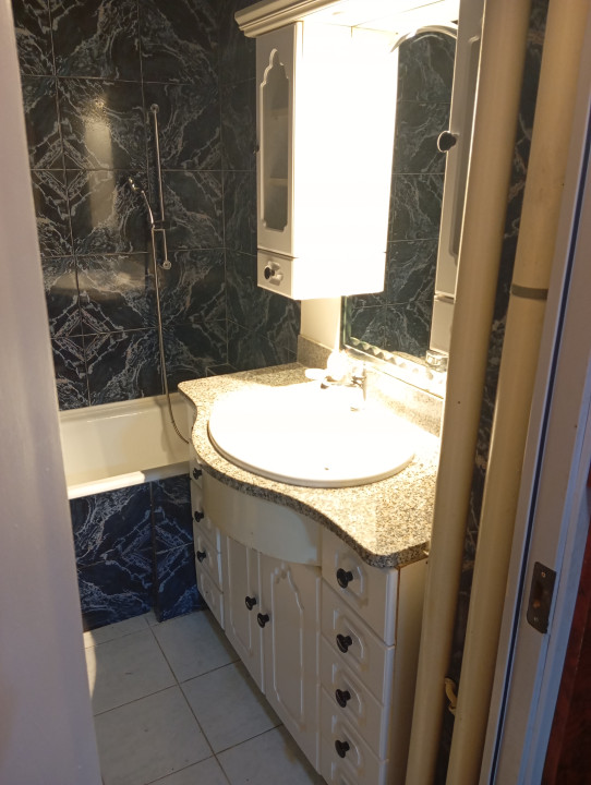 A kádas fürdőszobában márványlapos mosdó beépített kisszekrénnyel.