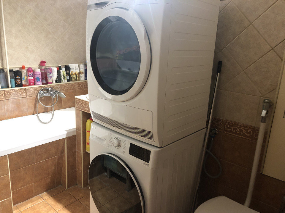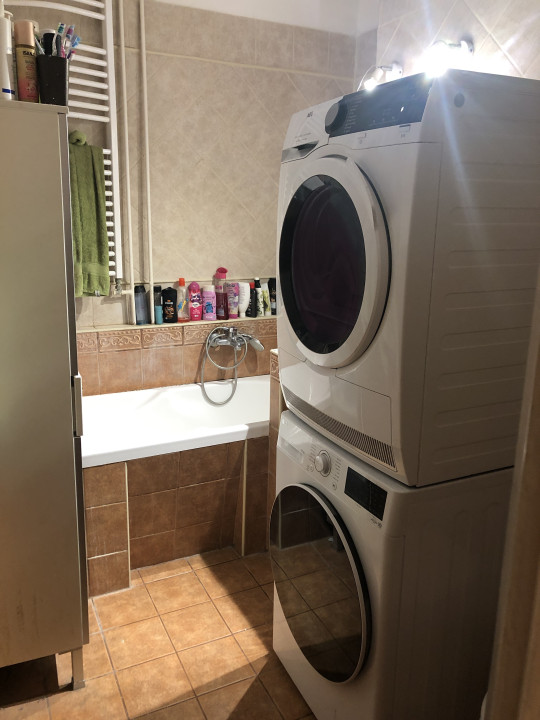 A kádas fürdőszobában a beépített mosdó mellett a mosógép-szárítógép is kényelmesen elfér.