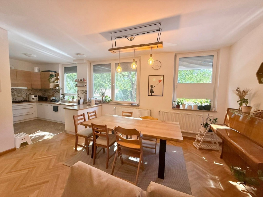 Pécs belvárosának peremén, a Hunyadi útnál eladó egy 91,5 m²-es, belső kétszintes, 2021-ben tejleskörűen felújított lakás. A lakás csendes utcára néz, saját udvara kellemes pihenésre alkalmas, a belváros 5 perc séta. Az alsó szinten nappali, egyedi bükkfa konyha étkezővel, kamrával, előszoba és külön WC, az emeleten két hálószoba, modern fürdő szauna-előkészítéssel, valamint tároló. Korszerű műszaki megoldások: új elektromos hálózat, rejtett fűtéscsövek, háromrétegű hő- és hangszigetelő nyílászárók, solar hővédő üvegezés. A lakáshoz tartozik egy autóbeálló, valamint igény szerint külön megvásárolható egy 26 m²-es garázs elektromos autótöltővel és almérővel (12 M Ft). Minőségi burkolatok, kiváló környék, minden fontos intézmény gyalogosan elérhető.