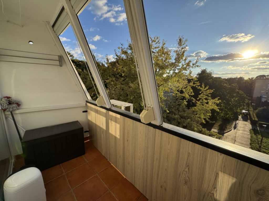 Az erkély kellemes, napfényes pihenőhely ? ideális reggeli kávézáshoz vagy egy kis zöld sarok kialakításához.