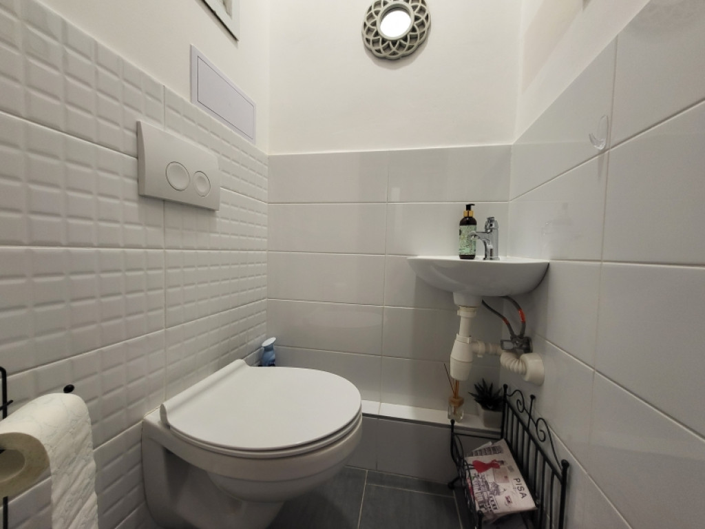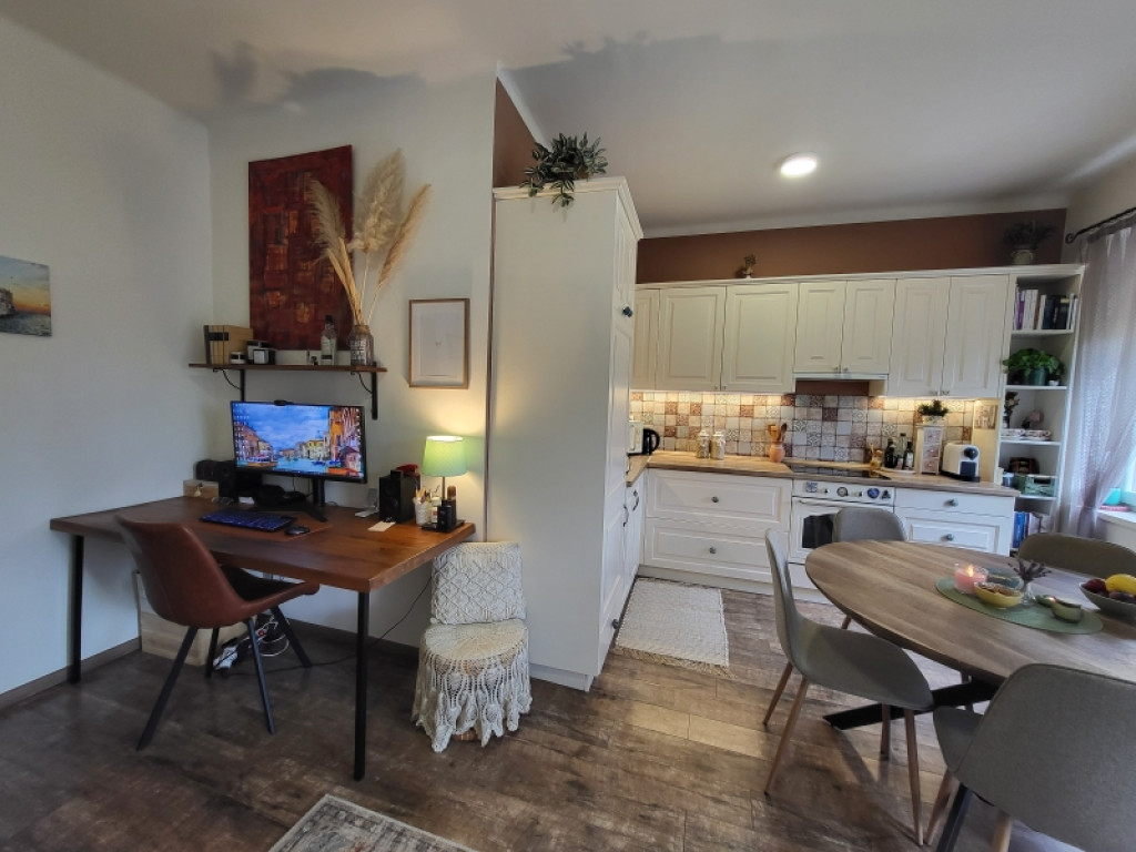 A konyha egyedileg készített, tömör fából készült bútorzatot kapott, amely beépített sütővel, főzőlappal és hűtővel gépesített. A lakás vételára részben tartalmazza a bútorokat, de igény esetén a berendezés megegyezés tárgyát képezi.