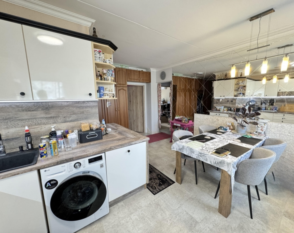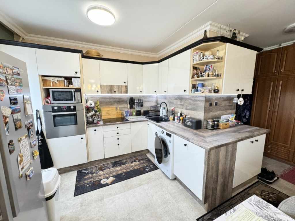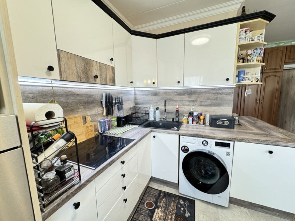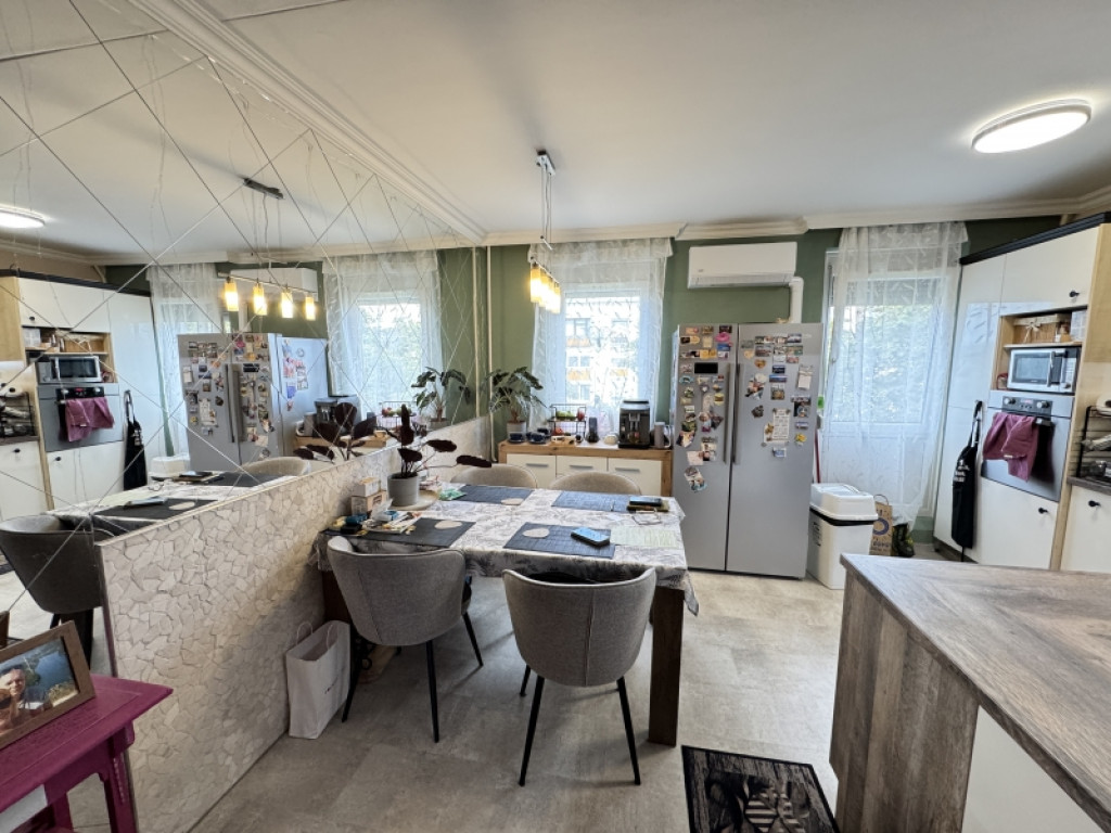 - A félszoba falának kivételével egy nagy, 21 m2- es konyha - étkező lett kialakítva, modern bútorral és beépíthető gépekkel, a mosógép is itt kapott helyet.