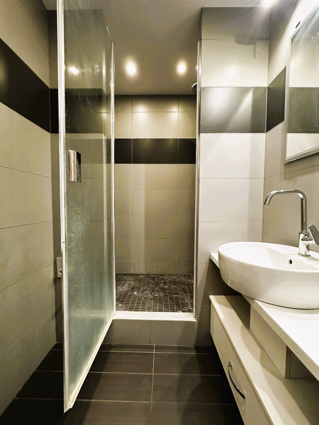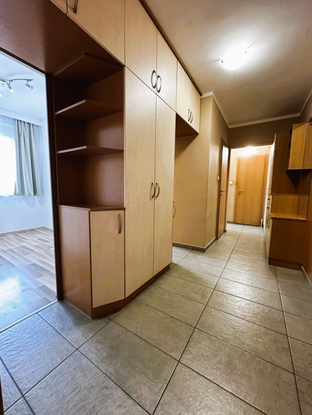 A fürdőszoba modern burkolatokat és kényelmes zuhanykabint kapott, a lakásban több beépített szekrény is található, amelyek rengeteg tárolóhelyet kínálnak.