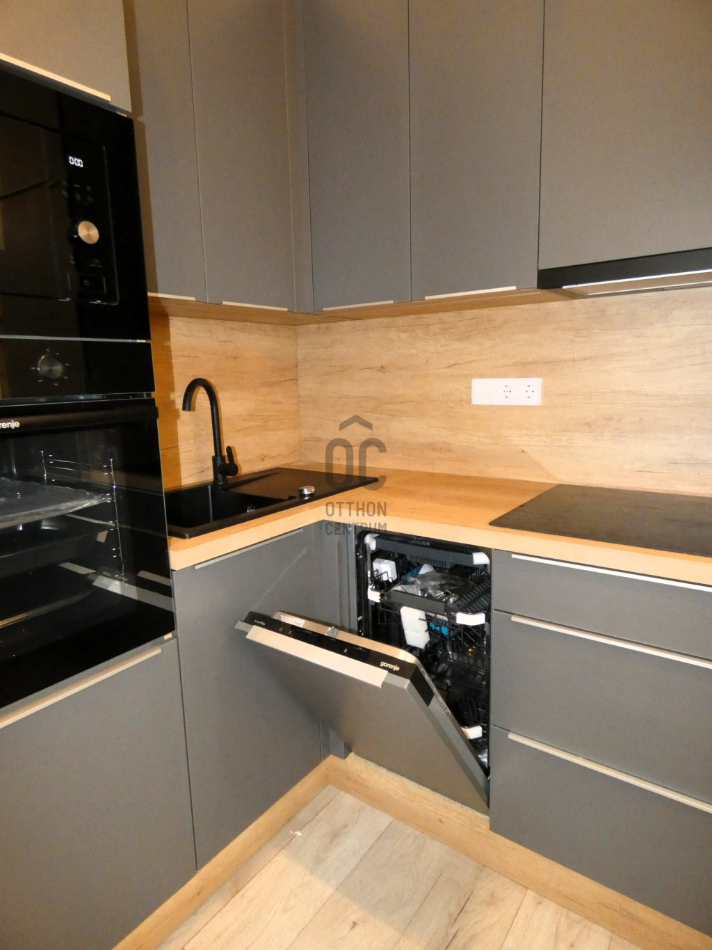 - konyha beépített mosogatógép, hűtő-fagyasztó, mikró, tűzhely