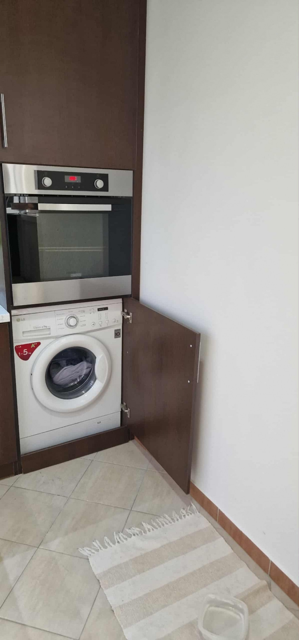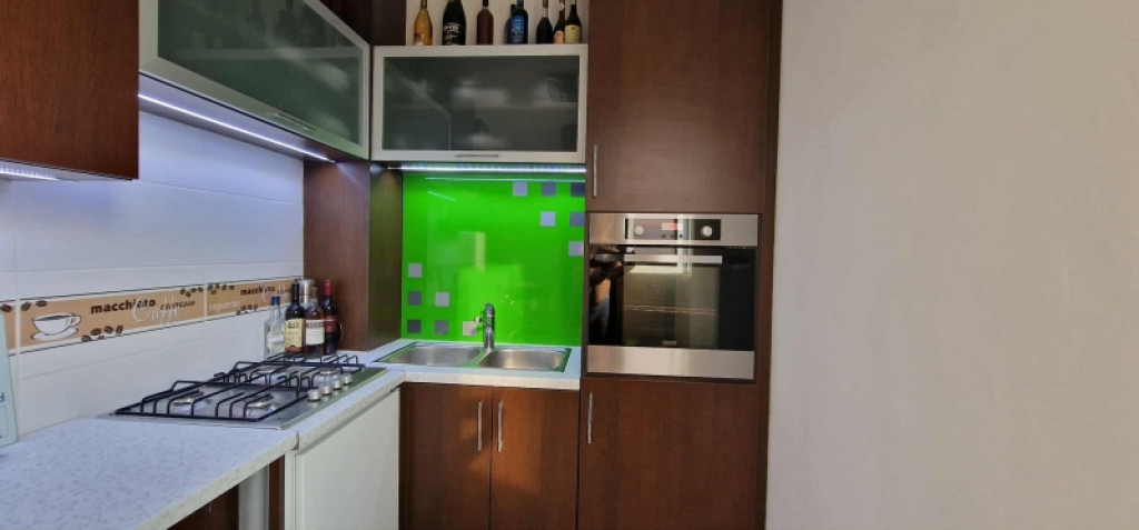 új gáztűzhely, beépített elektromos sütő és mosógép található benne