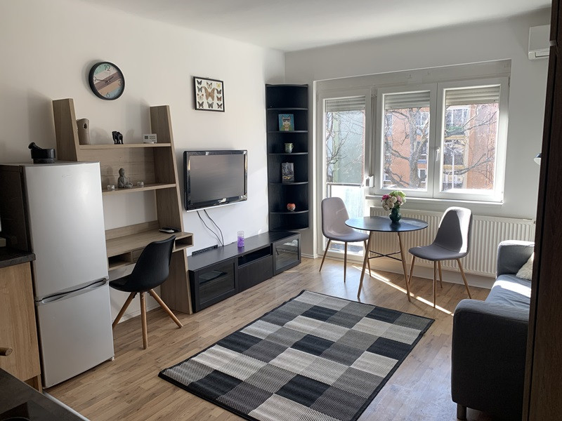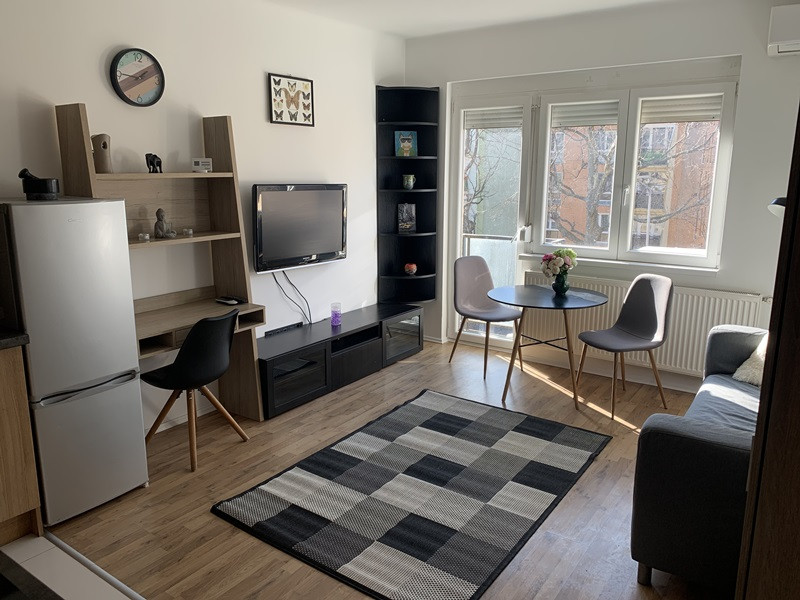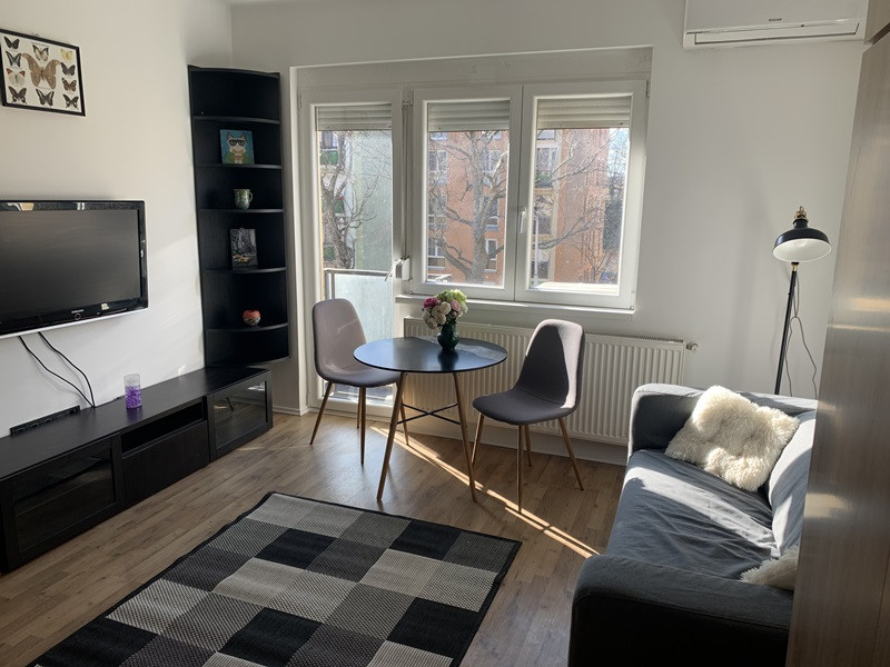 A fűtést gáz cirkó kazán biztosítja, a lakás légkondícionáló berendezéssel elátott. Beosztása különnyíló hálószoba+ amerikai konyhás nappali francia erkéllyel, valamint fürdő-wc.