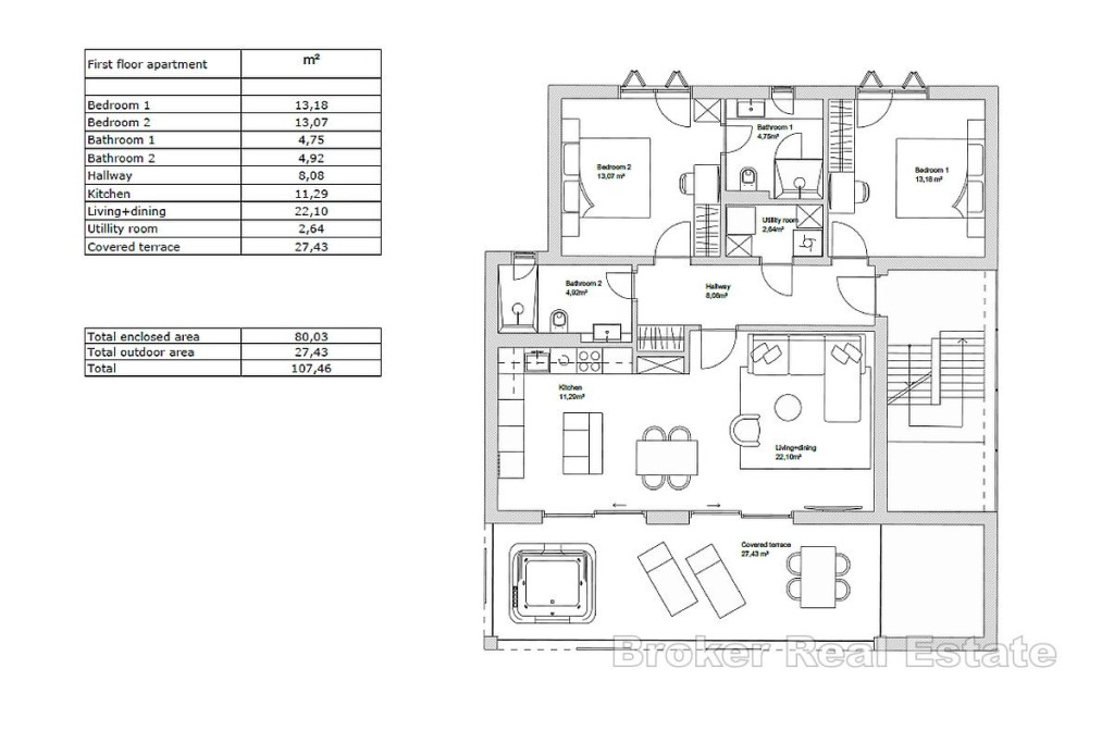 In an excellent location, above Primošten, within a smaller newly built building, a spacious two-bedroom apartment is for sale. It is located on the second floor and offers an open view of the sea. The apartment consists of two bedrooms, one of which has its own bathroom. It also contains another bathroom, a storage room and an open-concept living area that combines the kitchen, dining room and living room. The total living area of the apartment is 80m2, while the covered terrace covers 27m2. This apartment is an excellent investment for tourist rentals but also for family stays, considering the accommodation is away from the hustle and bustle and yet close enough to all relevant amenities. BROKER REFERENCE ID:5473/30b