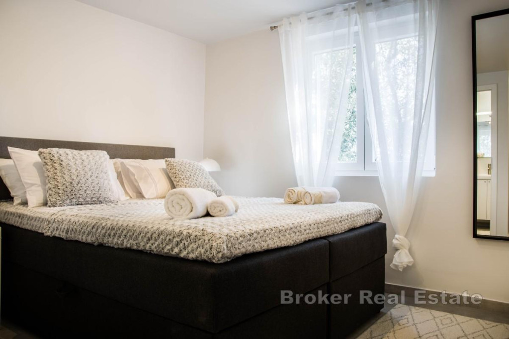 One-bedroom apartment of 38 m² is located on the ground floor and has a garden view. It consists of a living room with a kitchen and an additional bunk bed, and a bedroom with a private bathroom. The living room opens onto a spacious 8 m² terrace and a part of the garden that is used privately. The apartment has one parking space, with the option of purchasing additional ones, and a storage room. It is about 150 meters from the beach and the town center. BROKER REFERENCE ID:2022/474a