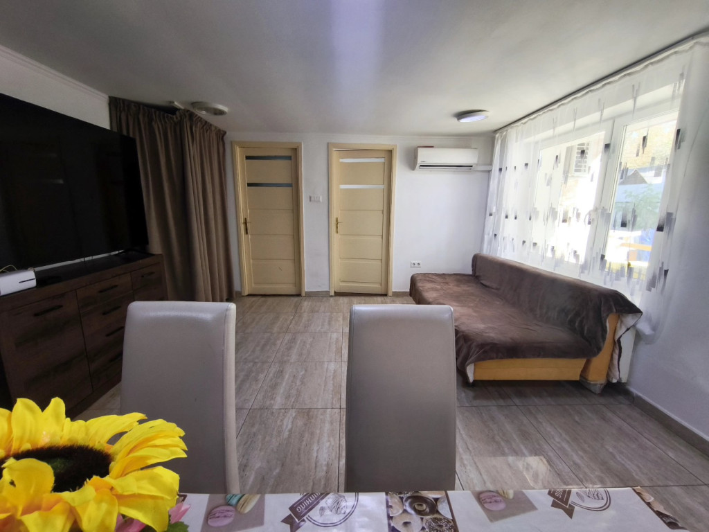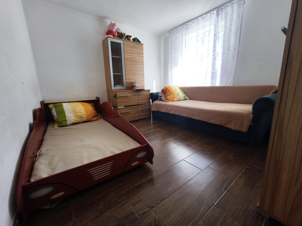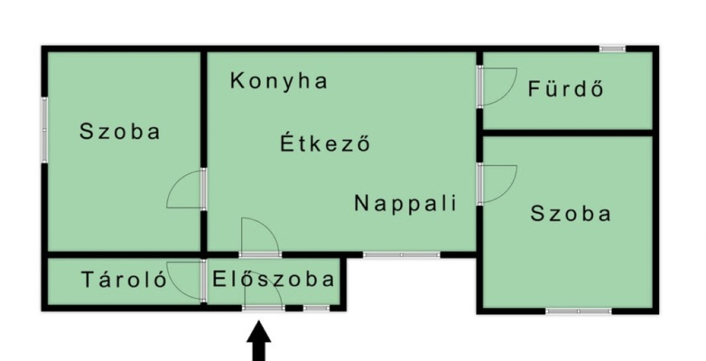Tágas világos étkezős nappalis konyha, 2 külön nyíló szoba, fürdőszoba + wc, előtér, tároló