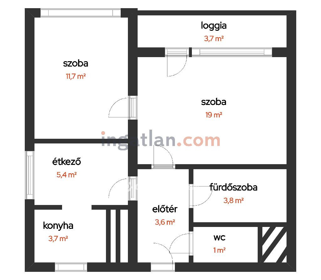 A lakásban 2 szoba, konyha, külön étkező, fürdőszoba és wc és előszoba található.