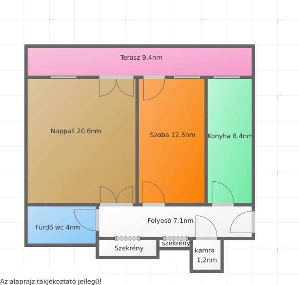 Elrendezés: 2 szoba, konyha, fürdőszoba, spájz, előszoba, erkély