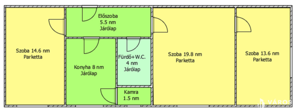 Helyiségei: 3 szoba, konyha, kamra, előszoba, fürdőszoba.