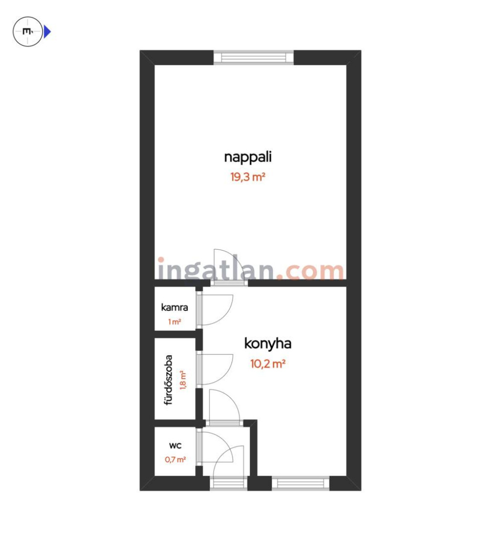Helyiségei: 1 szoba, konyha, fürdőszoba, külön nyíló W.C kamra.