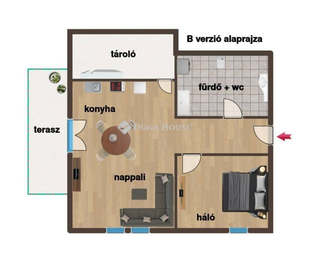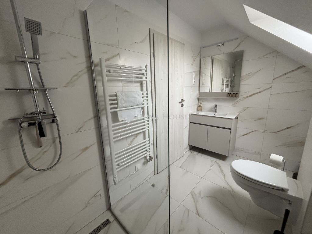 L6 lakás : A második emeleti (tetőtéri) ingatlan bruttó 44.25 m2, 8.38 m2 terasz tartozik hozzá panorámás kilátással a környékre. A belső kialakításra két opció is választható. A verzió: Tágas egylégterű amerikai konyhás nappali + fürdő + tároló + terasz. B verzió : Amerikai konyhás nappali + háló + fürdő + tároló + terasz.