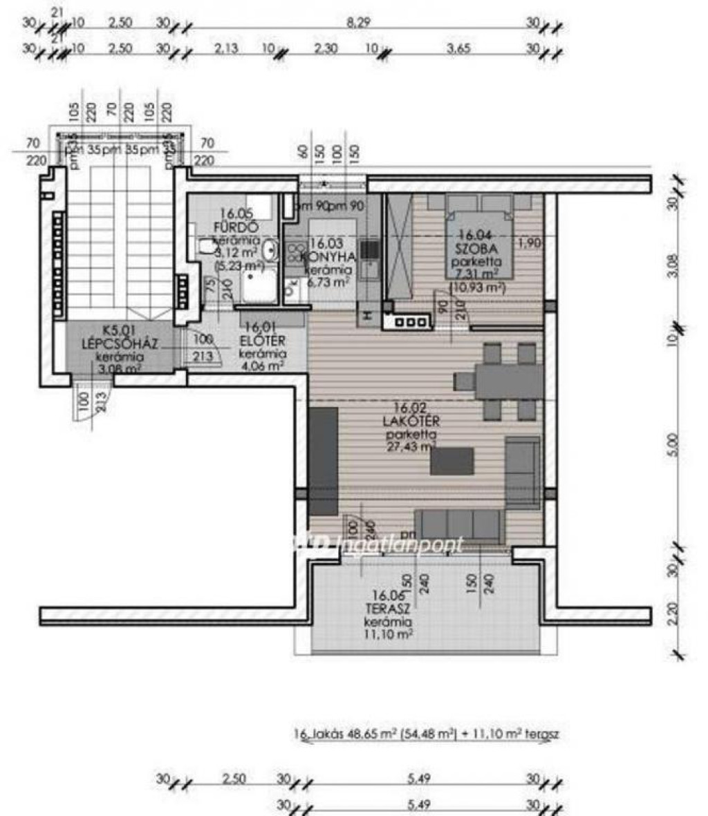 55,9nm 2 szobás, 11,41nm terasz. (terasz fele bele lett számolva az alap nettó nm-be.)
