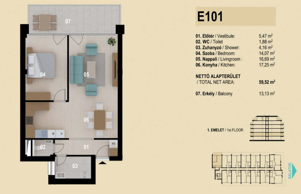 53-100 m2 közötti alapterületekkel, élhető erkélyekkel, földszinti kertkapcsolattal, tetőterén exkluzív panorámás tetőteraszokkal kínáljuk őket. Magas minőség, szigetelés, biztonsági üveg, antracit színű nyílászárók, fűtést-hűtést biztosító hőszivattyús rendszer, gyermekjátszótér, kültéri medence , épület előtt 3 km hosszú szabadstrand, parti sétányok várják a ház új lakóit.