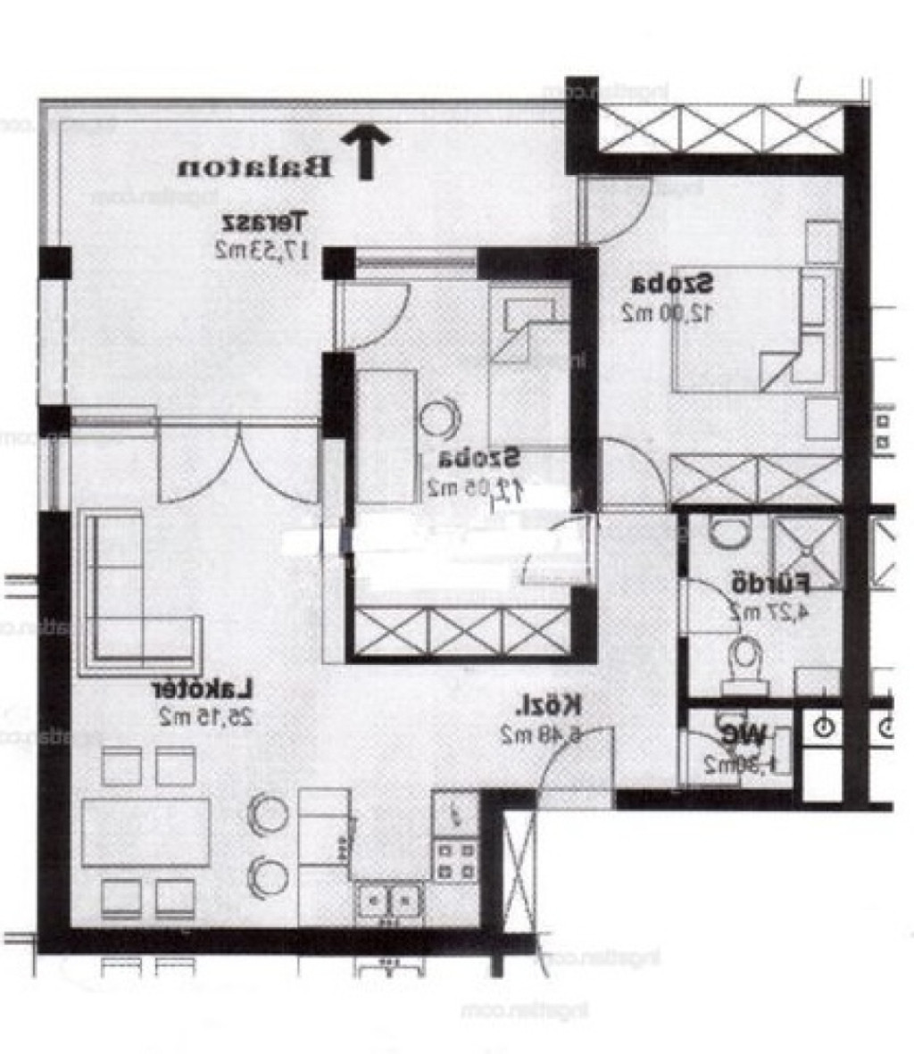 Az ingatlan nappali-amerikai konyhából, két hálószobából, fürdőszobából (hidromasszázs funkciós kád és zuhanyzó) és külön helységben lévő WC-ből, közlekedőből áll.