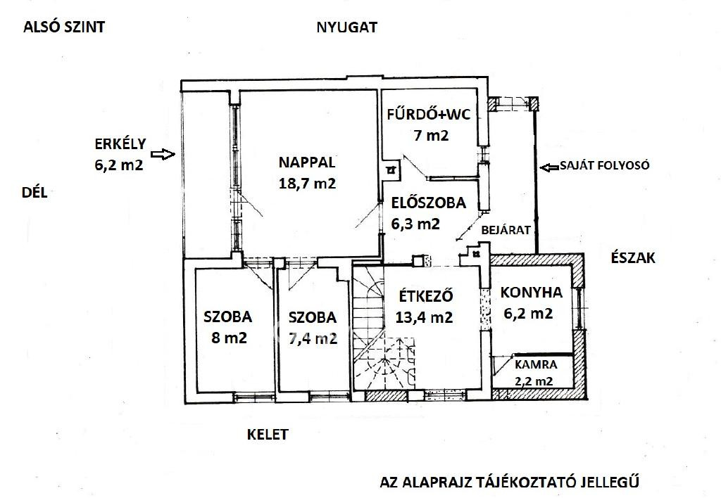 Az alsó szinten egy világos nappali található, amelyből két hálószoba nyílik, továbbá egy nagy étkező, tágas konyha külön kamrával, valamint egy ablakos, kádas fürdőszoba WC-vel kapott helyet.