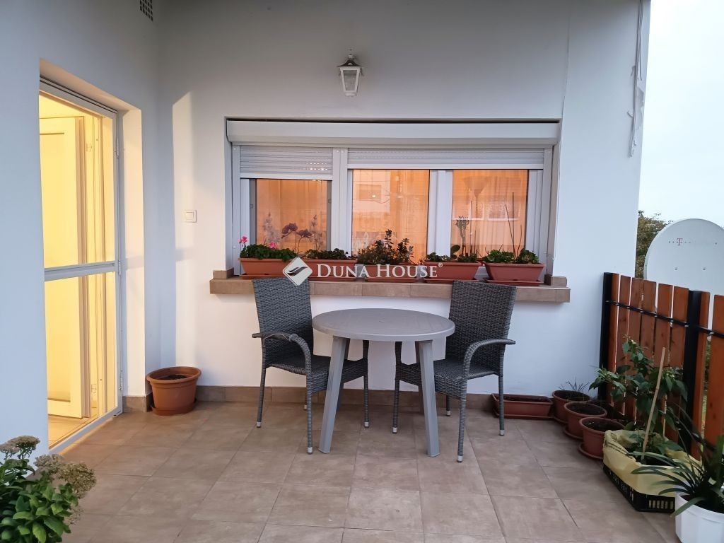 Az ingatlanhoz tartozik egy 12 m²-es, részben fedett terasz, amely kellemes helyszínt biztosít a pihenéshez vagy a reggeli kávé elfogyasztásához a zöld környezetben.
