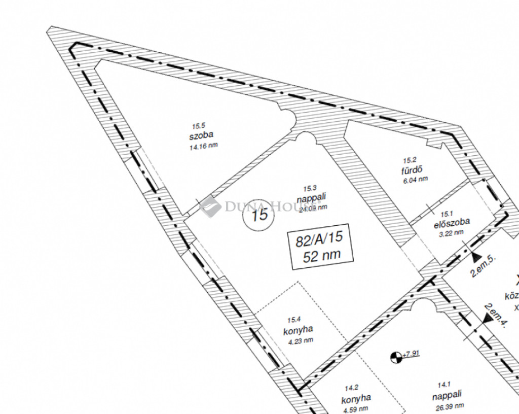 B15 lakás: A második emeleti ingatlan 52 m2 alapterületű,előtér, amerikai konyhás nappali egy háló és fürdőszoba kapott helyet benne, igényes burkolatokkal és szaniterekkel felszerelt, kilátással a sétáló utcára...