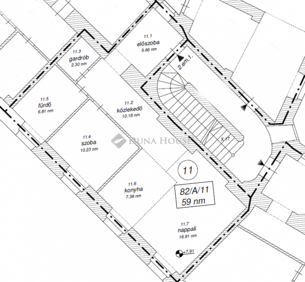 A 11 lakás: A második emeleti ingatlan 59 m2 alapterületű, amerikai konyhás nappali, egy hálószoba, gardrób és fürdőszoba kapott helyet benne, a hangulatos lakás tágas, világos, délnyugati tájolású, kilátással a sétáló utcára...