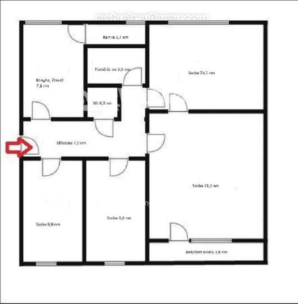 A lakás helyiségei, két nagyszoba, két kis félszoba, közlekedő, konyha, kamra, fürdő és wc.