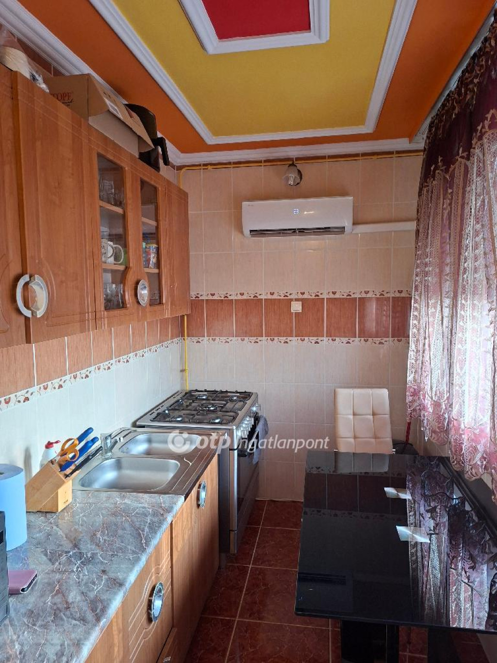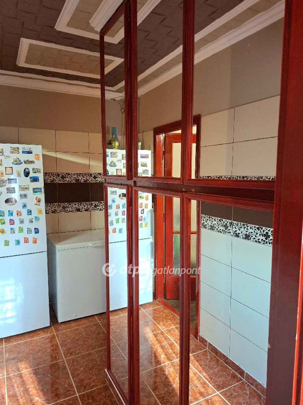 Ki kell emelni, hogy a konyha mennyezetig csempézett, tűzzománc díszítő elemekkel, míg a közlekedő ajtó magasságig gres lappal burkolt, amelyben szintén végig fut tűzzománc díszítő elem, amelyek különlegesen szép és egyedi ízlést tükröznek.