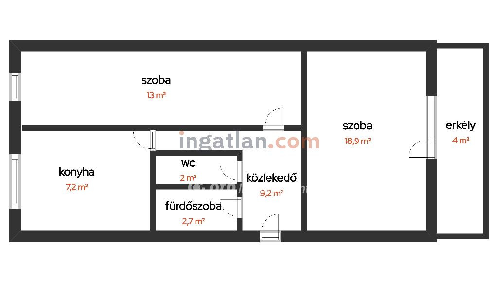 Az ingatlanban megtalálható 2 egész szoba, közlekedő, konyha, fürdőszoba, és külön wc.